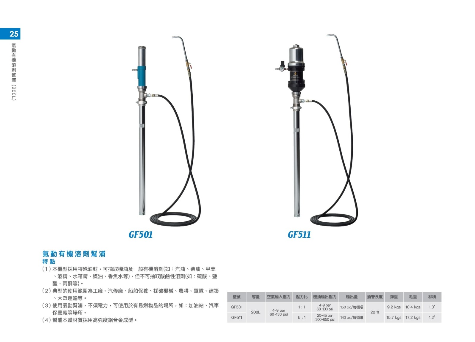 (3) 使用氣動幫浦,不須電力,可使用於有易燃物品的場所,如:加油站、汽車保養廠等場所。