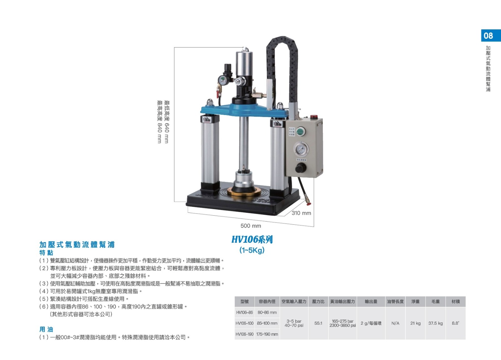 (3)使用氣壓缸輔助加壓,可用於高黏度潤滑脂或是一般幫浦不易抽取之潤滑脂。